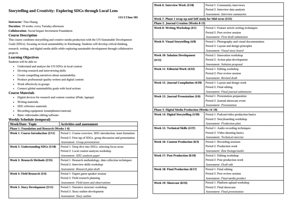 SWOT分析、永續發展人事物蒐集和分析、記敘文章寫作練習、訪談技巧練習與模擬訪談等,這個階段的學習目標為使學生具備足夠的先備知識和取得相關的實用資訊,並為後續的學習專案(Project)做好準備。除了課堂中的分組活動外,我也透過陶倢老師和基金會的資源,進行專家講座,讓學生了解永續發展的重要性和社會影響力。