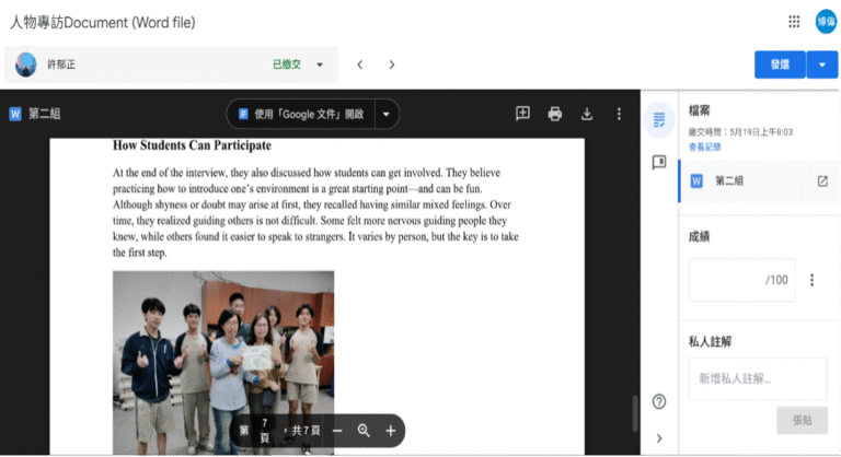 要將永續發展在地化,就必須先了解在自己生活的這個地方,有哪些人、哪些團體正在付出和努力經營,因此我請學生根據第一階段的資料和分析,分組尋找在地從事永續發展活動或相關的人物或組織,進行半結構式訪談,並分析訪談內容,撰寫成人物專訪文章。學生尋找適合的訪談對象的過程並不一定順利,因此我事先透過新莊社區大學,和一些組織團體取得聯繫,如新莊濕地服務隊、新莊故事遊藝隊等,讓學生作為參考,最後,七組學生也都分別找到符合自己設定主題的訪談對象,包括新莊藝文中心、惠瑜慈善協會、國際特赦組織成員、甚至社區清潔阿姨和本校校長都被邀請進行訪談。選定好訪談對象後,學生們便開始進行訪綱撰寫和事前準備,如填寫訪談參與同意書、製作感謝狀和約定訪談時間地點等。