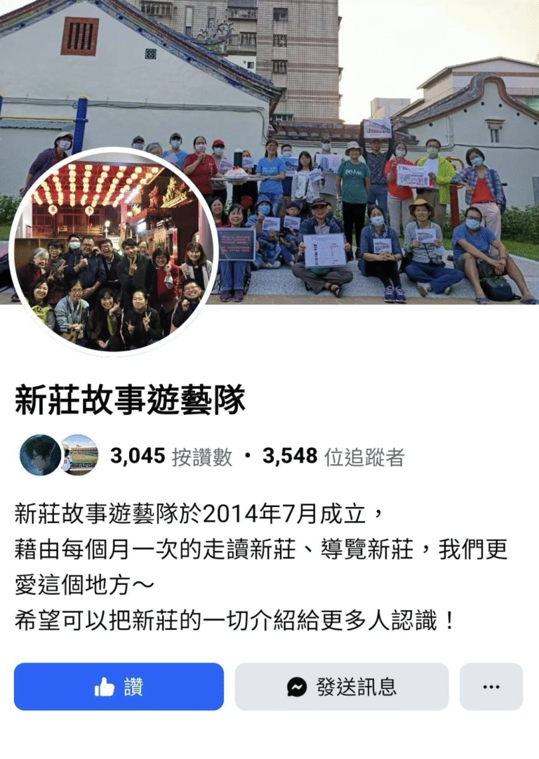 新莊遊藝團是一個致力於推廣新莊在地文化的組織,他們透過不定期的步行導覽、走讀活動,帶領有興趣的居民,走進屬於新莊的在地故事。他們最重要的使命之一,就是讓那些逐漸淡出大眾視野、漸漸被遺忘的在地文化景點,能夠重新被大家看見、被大家記得。以他們曾涉足的新莊老街來說:如今的新莊老街在大眾的視角中,逐漸被定位成「夜市」,而使文化意義越來越薄弱。